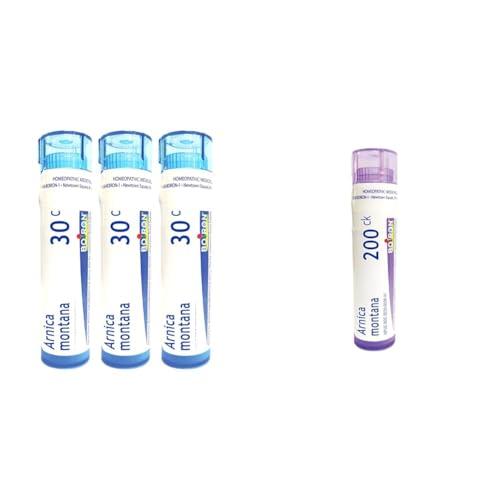 This bundle includes two complementary Boiron Arnica Montana homeopathic medicines to provide relief from muscle pain, stiffness, swelling, and bruising. The first component is a pack of 3 tubes of Boiron Arnica Montana 30c pellets, with each tube containing 80 pellets. This easy-to-take quick-dissolving homeopathic medicine relieves symptoms of muscle pain and stiffness from injuries, overexertion, falls, and bruising. Adults and children over 2 can take 5 pellets dissolved under the tongue up to 3 times daily. The second component is a bottle of 80 Boiron Arnica Montana 200CK pellets for additional pain relief. This higher potency homeopathic preparation provides temporary relief from muscle pain and stiffness related to minor injuries, overexertion, falls, and bruising. The convenient pellet form quickly dissolves under the tongue without needing water. Together, these two Boiron Arnica products offer a comprehensive approach to managing muscle soreness, pain, and swelling using natural active ingredients in homeopathic dilutions. The pellets are non-drowsy and can be combined with Arnicare topical treatments for a targeted effect without known drug interactions or side effects. This bundle allows you to keep the 30c potency handy for initial symptoms while having the stronger 200CK potency for more stubborn pain and inflammation.