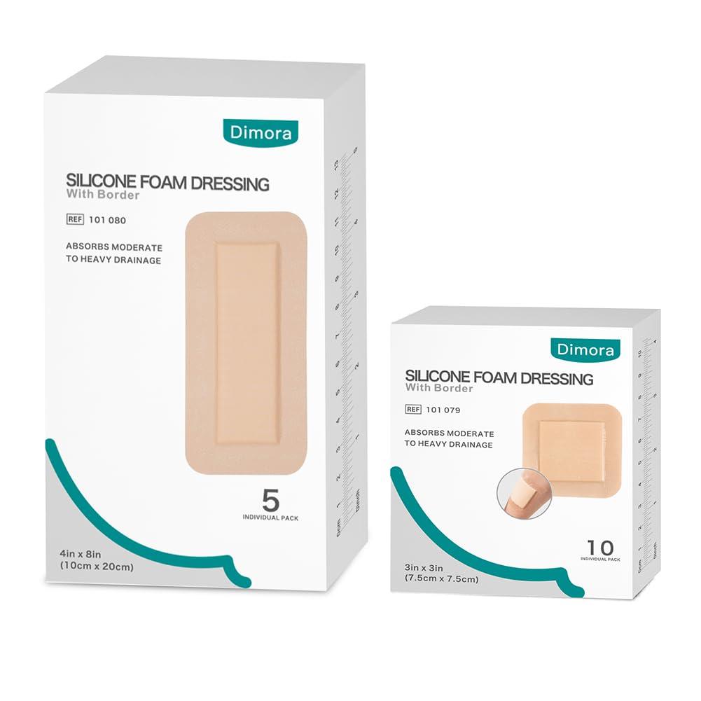 Dimora Silicone Foam Dressing with Border Adhesive 4"x8" 5Pack + 3"x3" 10Pack