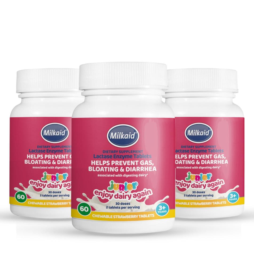 - NEW IMPROVED FORMULATION Milkaid has undergone a new and improved formulation as a result of consumer feedback on the taste of our products. Our products still come in the signature Raspberry (Milkaid Tablet) and Strawberry (Milkaid Junior) flavours. Whilst there will not be noticeable differences to the size, colour or shape of the tablet, consumers may notice an improvement to the taste and sweetness level of the tablet. There are no changes to the nutritional information, and still