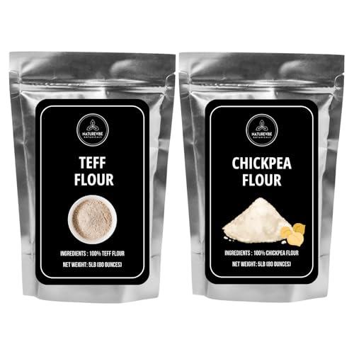 Teff (Eragrostis tef), a type of millet, is the world\'s tiniest cereal grain, about the size of a poppy seed. Teff can range in color from dark brown to red to ivory, with the darker varieties having an earthier taste. Teff has a sweet, nutty flavor reminiscent of hazelnuts. Teff Flour is great for baking and as a thickening agent for soups and sauces. The word \"teff\" comes from \"teffa,\" meaning \"lost\" in Amharic, because the seeds are so small, they\'re easily lost. Chickpeas are a type of pulse, with one seedpod containing two or three peas. It has white flowers with blue, violet, or pink veins. Chickpea flour, also known as gram, besan, or garbanzo bean flour, has been a staple in Indian cooking for centuries. Chickpeas are versatile legumes with a mild, nutty taste, and chickpea flour is typically made from a variety called Bengal grams.