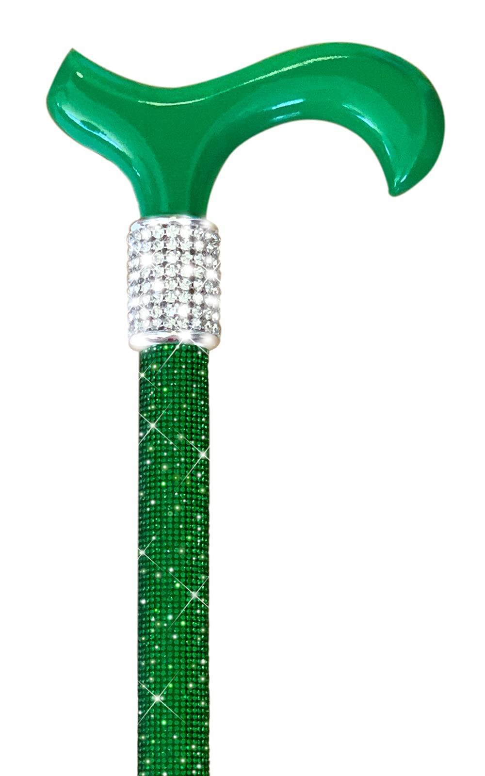 - BLINGED-OUT BALANCE: This stylish green rhinestone cane is made for walking and is a total fashion statement. Can accommodate up to 210 pounds. PLEASE NOTE: Canes come in three sizes: Small, Medium and Large. See sizing chart or scroll down on page for more details based on height IN SHOES. HELPFUL: For BEST FIT, compare cane height measurements to those of a cane you own that works for you. Makes a beautifully blinged out gift for a fashion conscious person resistant to using an ordinary cane.