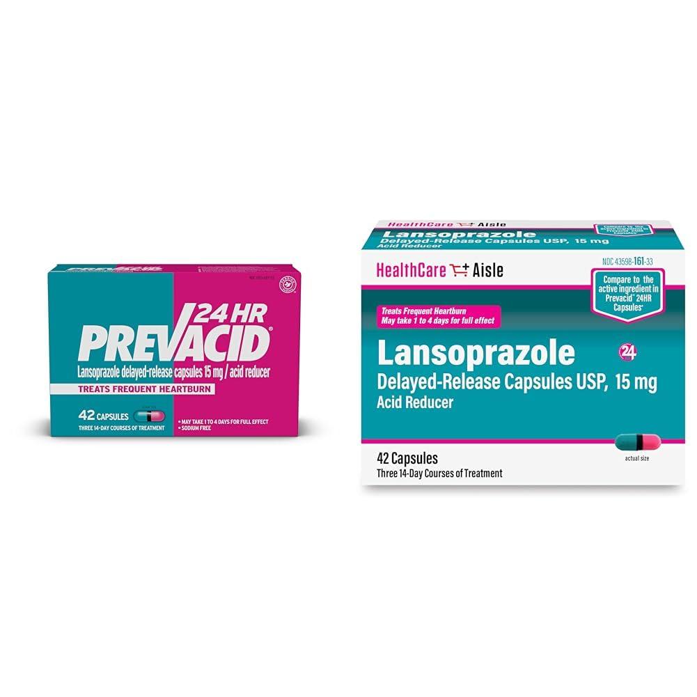 This bundle includes 42 capsules each of two products that provide all-day relief from frequent heartburn occurring two or more days a week - Prevacid 24HR Lansoprazole Delayed-Release Capsules and HealthCareAisle Lansoprazole Delayed Release Capsules. Both products contain 15 mg of the active ingredient lansoprazole which is a proton pump inhibitor that stops acid production by turning off the pumps releasing acid into the stomach. By preventing excess stomach acid that causes heartburn, these capsules can provide 24-hour relief so you can enjoy meals, sleep better, and have good times without painful burning sensations. The Prevacid 24HR capsules are clinically proven to treat frequent heartburn with 14 days of use. The HealthCareAisle capsules have a comparable active ingredient to Prevacid 24HR. Both products provide an easy one capsule per day, 14-day course of treatment. While not intended for immediate relief, some people report complete relief of heartburn symptoms within 24 hours. With 42 capsules each of two trusted lansoprazole acid reducers, this bundle lets you treat frequent heartburn occurring multiple times a week and stop painful acid reflux at the source - right inside your stomach.