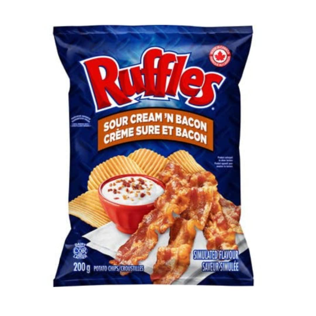 Mmmm... Bacon! Bacon makes everything better, am I right? Now, imagine a bacon-flavoured potato chip. Epic. Add the flavour of sour cream and you've got something even better than amazing - MIND-BLOWING. Ruffles Sour Cream 'n Bacon flavoured potato chips. Its a flavour combination so incredible you'll be speechless. Your taste buds dont know what theyre missing. Ruffles is Canadas favourite ridged potato chip brand, delivering big, satisfying crunch and mouth-watering taste with every bag! Whether youre kicking back with family, watching the game, or just treating yourself to something truly delicious, Ruffles potato chips always hit the spot. And here in Canada, we know the snack table wouldnt be complete without a signature bag of Ruffles!