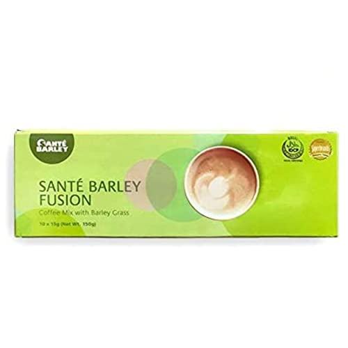 Sante Barley Fusion Coffee Mix With Barley Grass (10 Sachets x 150g). Smell the aroma. Classic Robusta coffee beans mixed with New Zealand Organic barley grass powder. Ingredients: Non-dairy creamer (Glucose Syrup, Vegetable Fat, Stabilizers, Milk Protein, Emulsifier, Anti-Caking agent, Coloring), Sugar, Coffee, Organic Barley grass powder, Steviol Glycoside