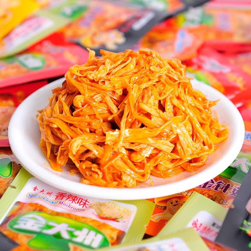 - Delicious and Spicy: Our Spicy Enoki Mushroom, Latiao, and Spicy Strip snack combination is sure to please your taste buds! Excellent for Sharing: Our 100g or 500g pack makes for a great snack option for a night of entertaining guests or movie nights with family and friends.